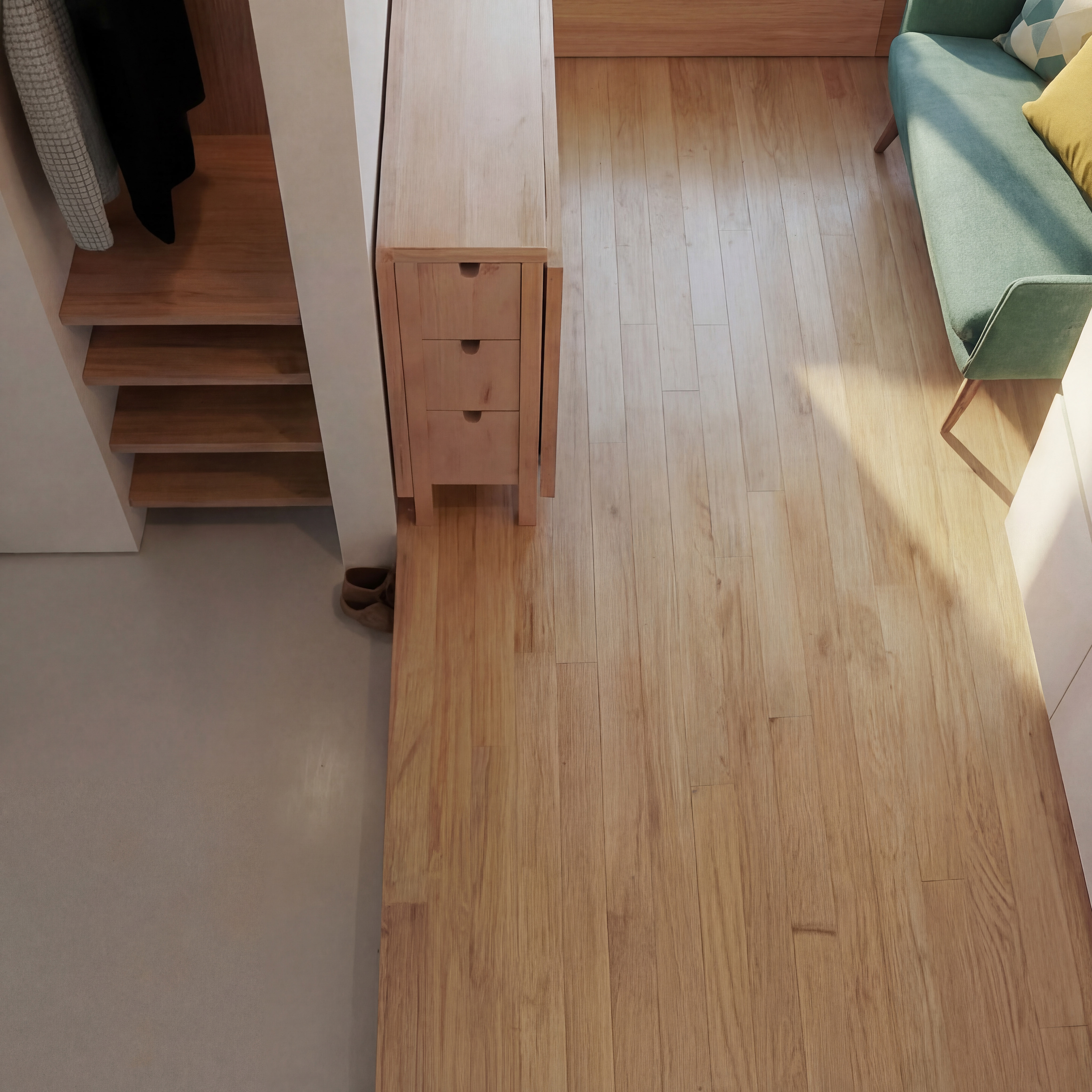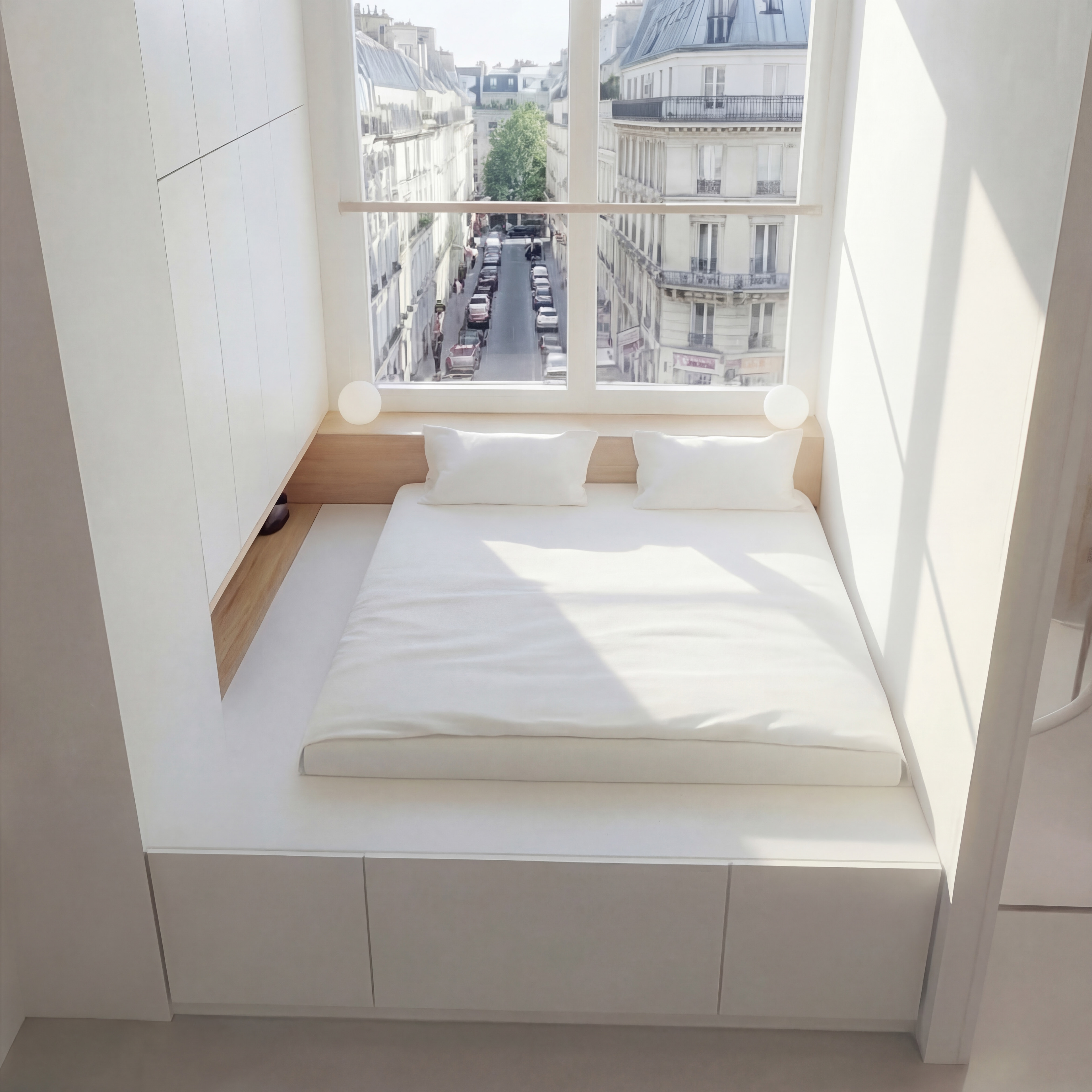 Le choix est fait de créer des estrades pour délimiter les zones et créer du rangement supplémentaire, notamment sous et sur le côté du lit.